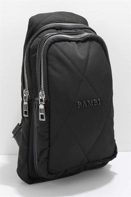 Musta kankainen edessä pidettävä rintalaukku. Kevyt, pienikokoinen, mutta kuitenkin riittävän tilava laukku, näppärä vaikka lenkille tai kaupungille, kun haluat pitää kädet vapaana.